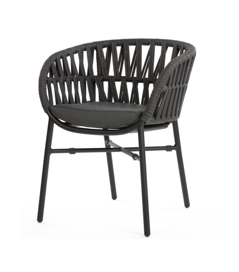 Sillón apilable de aluminio para exterior, color negro, con cuerda trenzada de poliolefina y cojín tapizado.