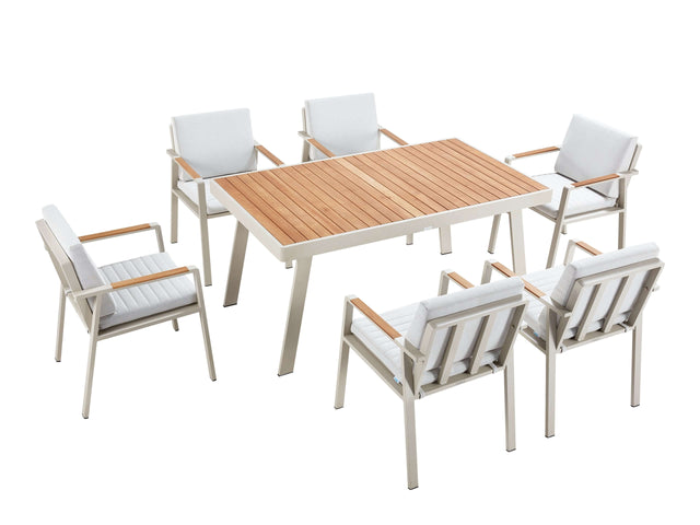 Modern és elegáns megjelenésű kerti étkező garnitúra 6 fő részére, amely ideális választás családi étkezésekhez vagy baráti összejövetelekhez a kertben és a teraszon. A letisztult design és a természetes teakfa részletek időtálló karaktert adnak a kültéri térnek.